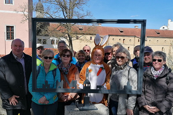 Weiter ging der Rundgang zum Kurfürstenring auf die Vilsbrücke. Hier konnte man die Aussicht auf das Schloss, die Amberger Stadtbrille und die Basilika St. Martin genießen. Bei einer Pause auf der Sitzgruppe beim Brückenheiligen St. Nepomuk überraschte plötzlich der Osterhase alias Alfons Wanninger die Emmausgruppe mit seinem Besuch und verteilte Schokohasen und -eier zur Freude aller.