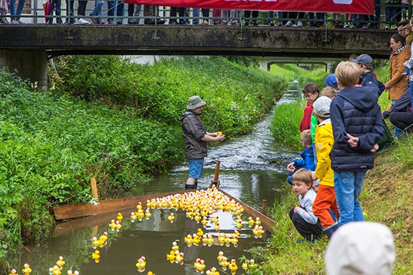 Trotz zeitweisem Regen lockte das 14. Entenrennen der Kolpingsfamilie Ergoldsbach zahlreiche Besucher aus der Marktgemeinde und der Region an den Goldbach. Pünktlich um 15 Uhr erfolgte der Massenstart der 450 gelben Gummienten.