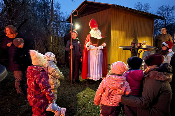 Im Anschluss daran gab es Bratwürste und heiße Getränke am Lagerfeuer und auch der Nikolaus kam vorbei und hatte lobende Worte für die Kinder und die gute Arbeit der Kolpingsfamilie dabei. Für jedes Kind hatte er auch ein Geschenk im Gepäck.