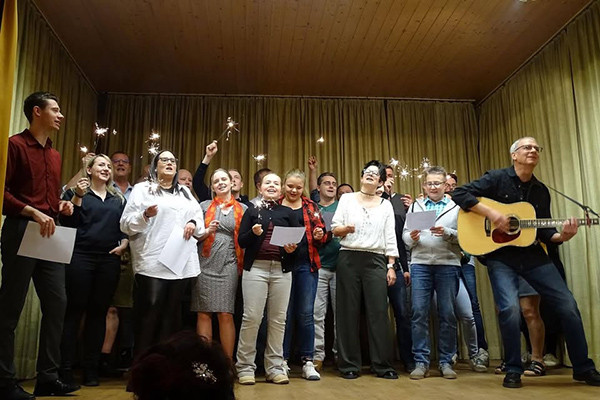 Beim Stück “Altbayerisch für Einsteiger” war auch Präses Pfarrer Thomas Fischer mit von der Partie. Unser Bild zeigt die Mitwirkenden ohne Kostüme beim Abschlussbild mit Gesang.